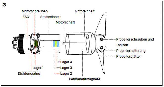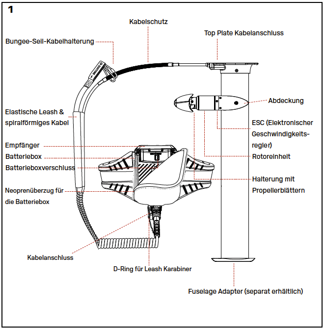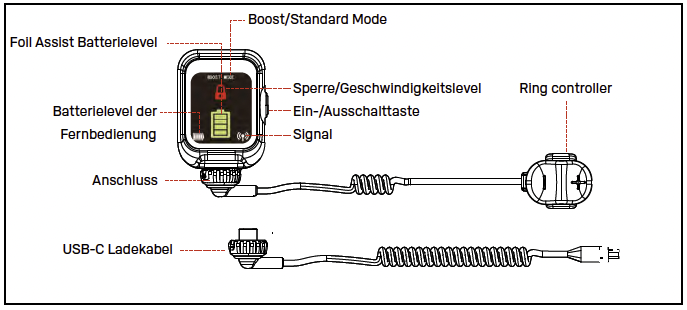 Das Foil-Assist-System besteht aus mehreren Komponenten: dem Mast mit elektrischem Antrieb, der Leash samt Stromkabel, dem eTrapez sowie der Fernbedienung.