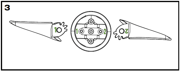 - Die Blätter sind mit 1 und 2 markiert. Achte darauf, dass jede Nummer zur entsprechenden Markierung an der Propellerhalterung passt. Überprüfe außerdem, ob die Rillen der Blätter korrekt übereinanderliegen, damit sie sich frei ein- und ausklappen können.