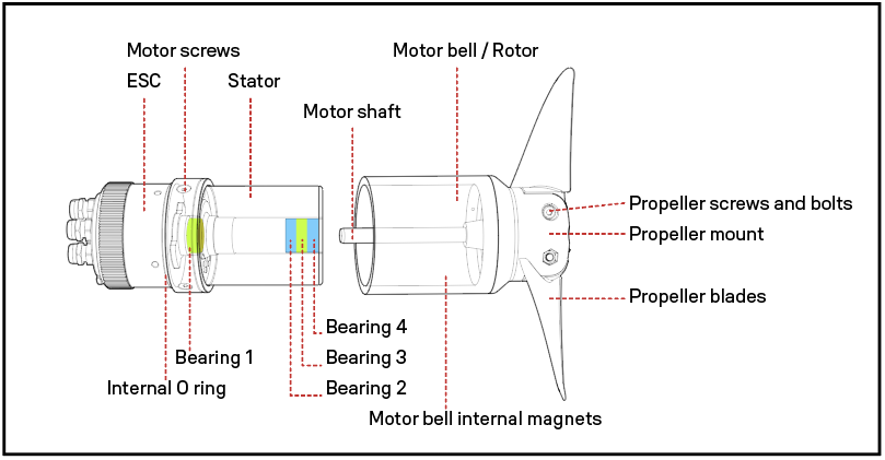 The motor contains four stainless steel bearings that ensure the motor bell rotates smoothly along with the propeller. These bearings can wear out over time and should therefore be replaced regularly. If the drive unit makes strange noises or no longer runs smoothly, it’s time to change the bearings. To replace the bearings, you will need a special tool, which we offer along with the Foil Assist Maintenance Tools (40260-8007).