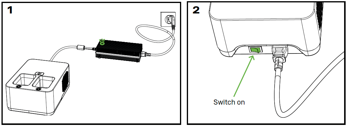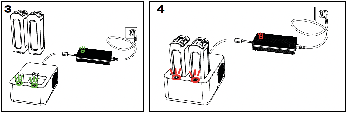 | Inserta las baterías en el dock (verifica la polaridad + / -) | Presiona los botones en la base de carga para comenzar a cargar. Los botones se pondrán rojos y el ventilador de refrigeración interno se encenderá. |
