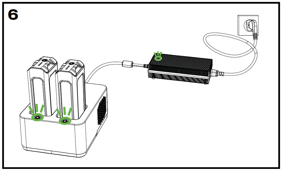 Una vez que las baterías estén completamente cargadas, todos los LED se apagarán y las luces de los botones de la base de carga se volverán verdes. Retira las baterías y apaga el cargador.