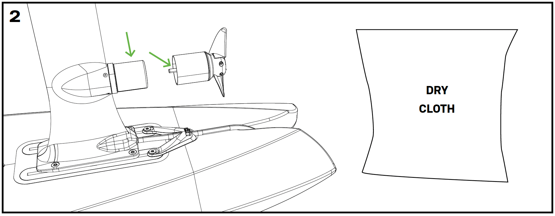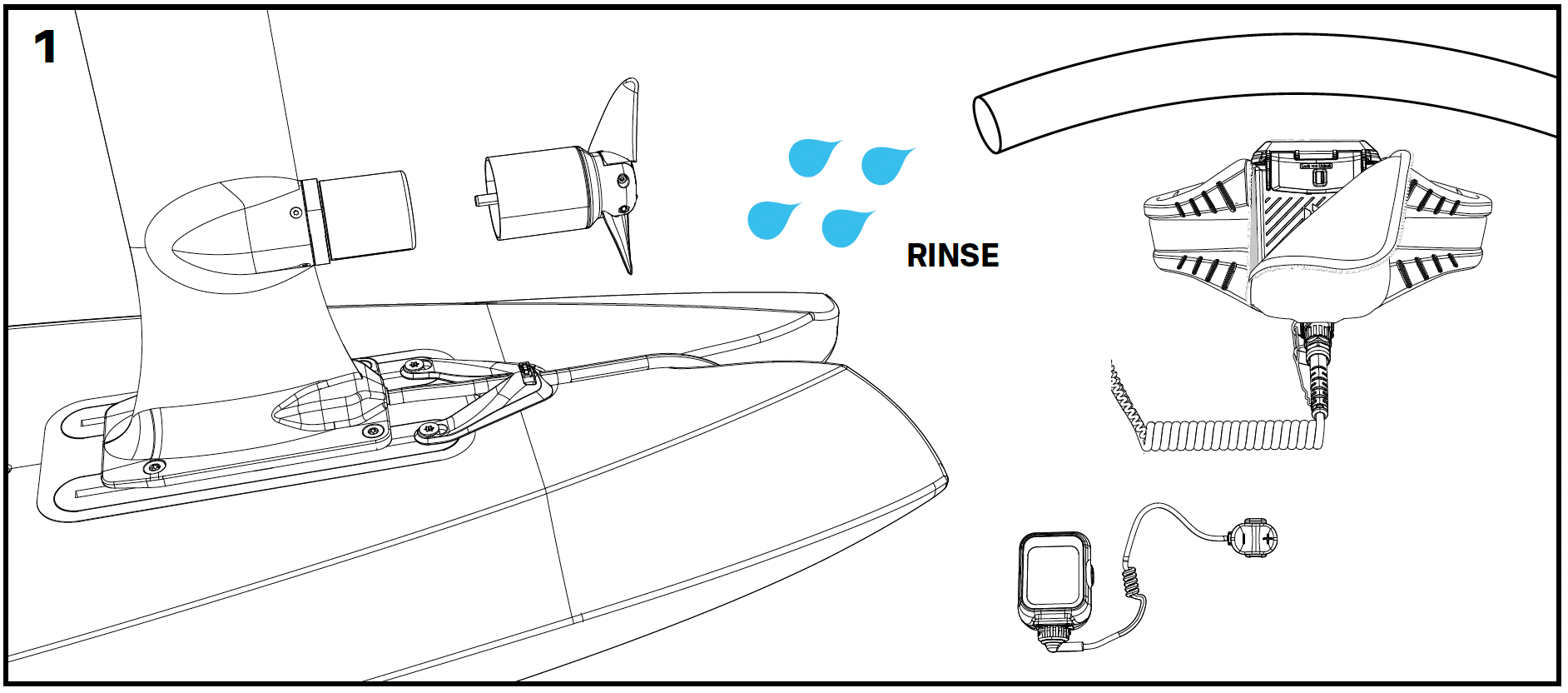 Risciacqua l’imbrago e la batteria con la chiusura serrata e il cavo collegato. Rimuovi il campana del motore (motor bell) e risciacqua accuratamente l’interno della campana e i cuscinetti del motore. Risciacqua anche il telecomando (watch remote) e il ring controller.