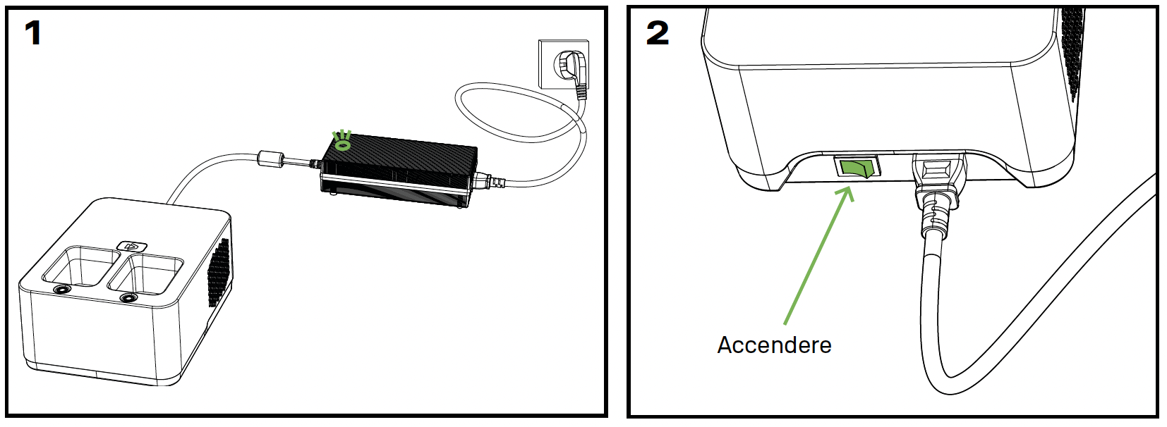 ❗ Importante: Carica e scarica sempre le batterie a casa, sotto supervisione e in un ambiente ben ventilato. Assicurati che non ci siano ostruzioni vicino alle prese d’aria laterali del caricatore. L’aria espulsa può essere calda, quindi tieni oggetti a una distanza di sicurezza dalle prese d’aria. Non lasciare mai il sistema collegato alla corrente quando non è in uso.