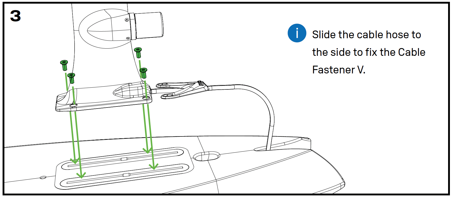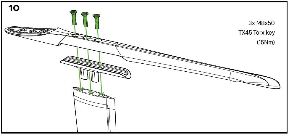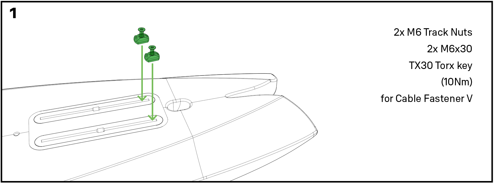 Coloque a placa superior do eMast e o Fixador de Cabo V nos trilhos do foil e insira os parafusos.