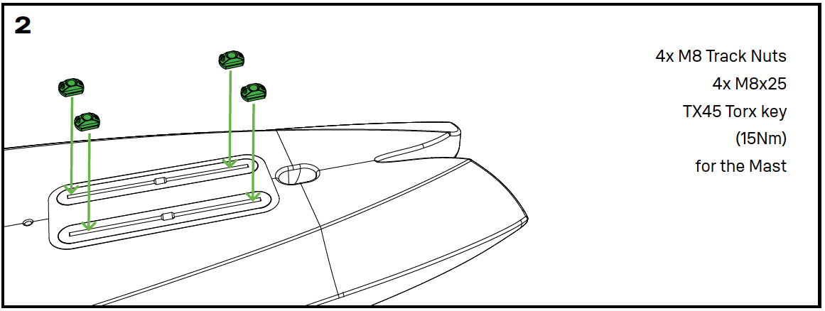 Em seguida, coloque os quatro parafusos e porcas maiores na parte frontal e traseira dos trilhos do foil. Se você estiver montando o eMast D/LAB, remova os parafusos das porcas e insira apenas as porcas T.